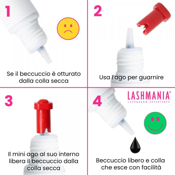 - Dopo ogni goccia si consiglia di schiacciare leggermente il flaconcino della colla per far fuoriuscire eventuali bolle d'aria;