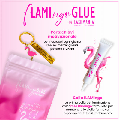 Un set unico che abbina l’affidabilità della colla LAMI con il packaging rosa fLAMIngo firmato LashMania, accompagnato da una bustina coordinata e da un portachiavi motivazionale.