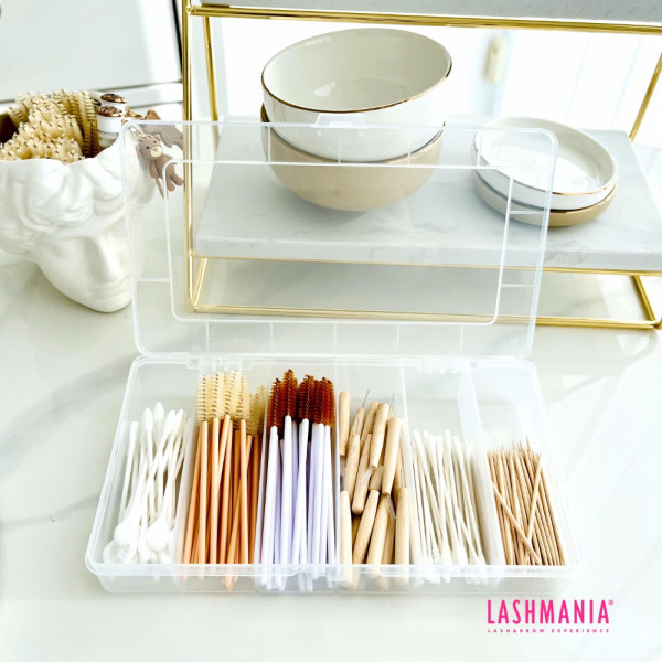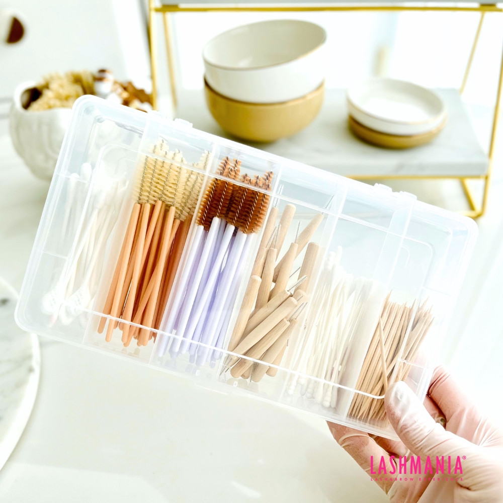 Pratico organizer trasparente by Many Beauty è progettato per tenere in ordine microbrush, scovolini, applicatori, bastoncini in legno e cotton fioc professionali, come quelli mostrati in foto, rendendo ogni accessorio subito visibile e facilmente accessibile durante i trattamenti.
