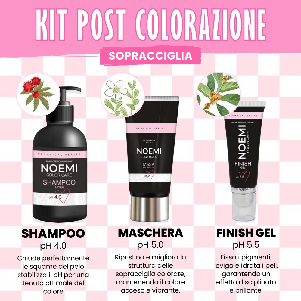 Un kit professionale by Noemi pensato per garantire un risultato impeccabile dopo la colorazione delle sopracciglia. Grazie alla combinazione dello Shampoo pH 4.0, della Maschera pH 5.0 e del Finish Gel, assicura la stabilizzazione del colore, il nutrimento dei peli e una finitura impeccabile. Perfetto per brow artist e lashmaker che vogliono offrire un trattamento completo e di alta qualità.