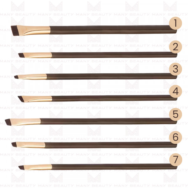 • N.7 – Pennello piccolo obliquo per sopracciglia ed eyeliner (versione compatta): la dimensione ridotta lo rende ideale per i dettagli estremi e le finiture ultra sottili.
